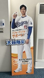 プール棟フロントに大谷翔平等身大パネル有ります😁ジュニア会員のみんな‼️ ハンコカードがいっぱいになったら、 1枚につきシンクロンコーワドリンク🥫1本と交換できるよ😉 大谷翔平の本物と同じ大きさを見に行こう😆